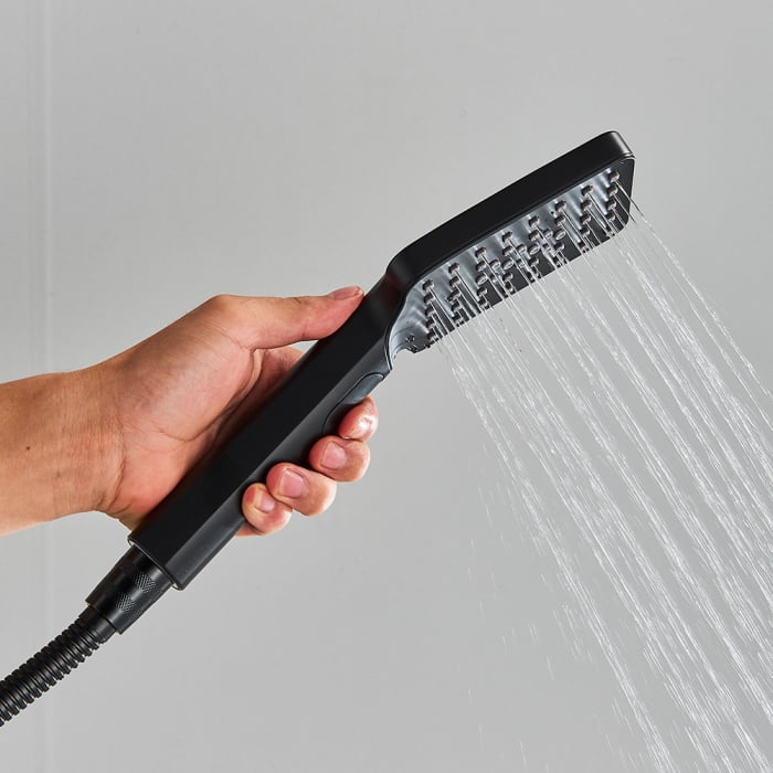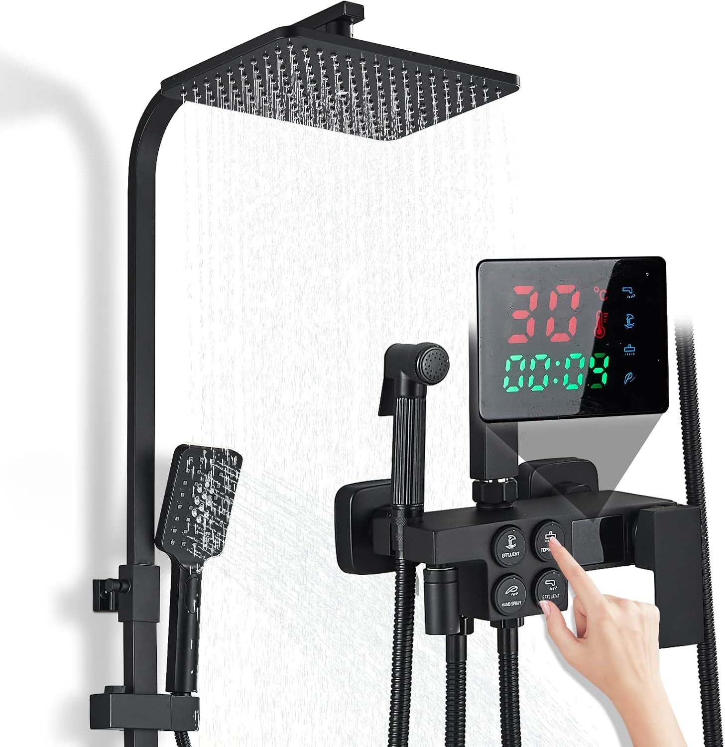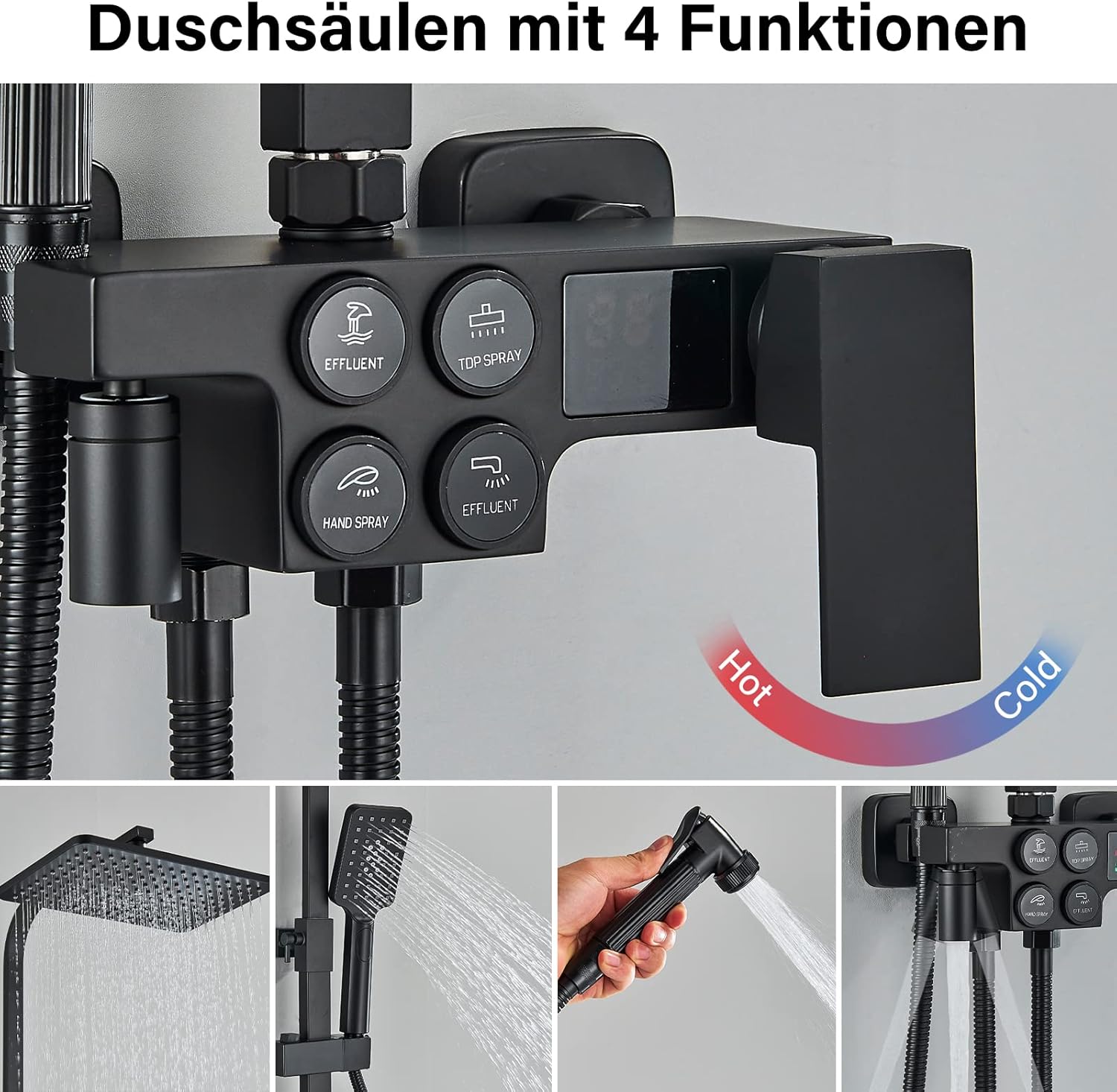 Panoul de duș are display LED integrat pentru temperatură, duze reglabile de masaj pentru corp, gură de umplere pentru cadă și o pară de duș multifuncțională. LED-ul funcționează prin fluxul de apă, fără baterii – un design mai sigur.